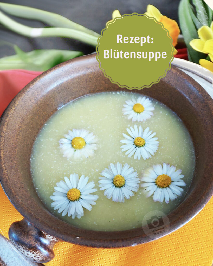 Zutaten für einen Suppentraum für 2 Personen: 1 l Gemüsebrühe, 1 Kartoffel, 2 EL Sahne, eine Handvoll essbare Blüten (z.B. Gänseblümchen, Ringelblume, Kapuzinerkresse, Löwenzahn).