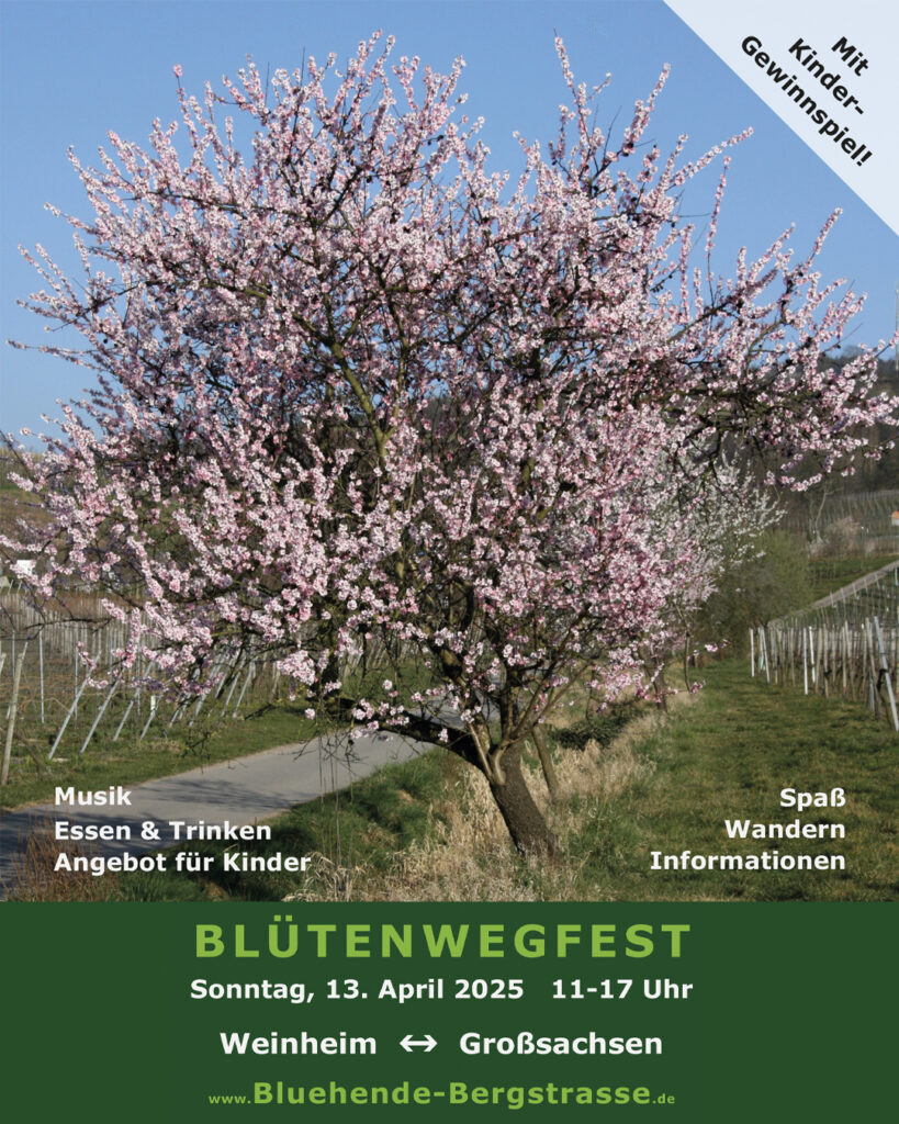 Das Blütenwegfest, eine Erlebnis- und Genusswanderung auf dem Blütenweg, der entlang der Badischen Bergstraße führt, findet in diesem Jahr am Sonntag, 13. April (11 Uhr bis 17 Uhr), statt. Der Abschnitt in diesem Jahr liegt zwischen dem Weinheimer Schlosspark und dem historischen Marbacher Hof in den Weinbergen von Hirschberg-Großsachsen. Das Blütenwegfest ist diesmal Teil des Weinheimer Heimattage-Programms.