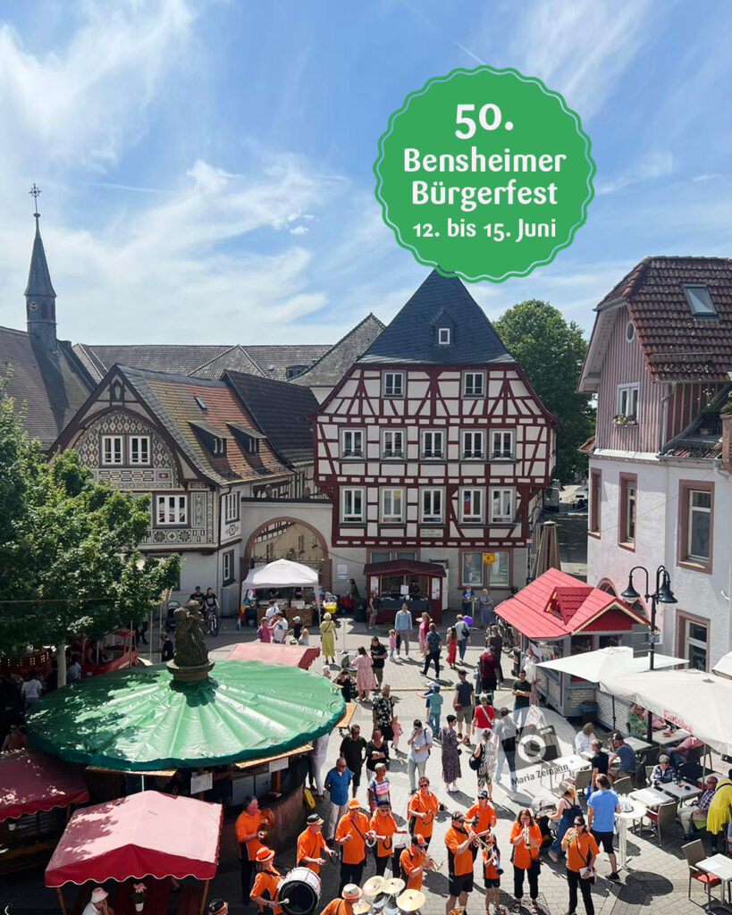 Das attraktive und populäre Bensheimer Bürgerfest ist seit 1975 das Fest der Bensheimer Vereine und Nationalitäten. Es findet vom 12. bis 15. Juni 2025 zum 50. Mal mit einem bunten Programm und jeder Menge Live-Musik auf vier Bühnen in der Fußgängerzone statt.